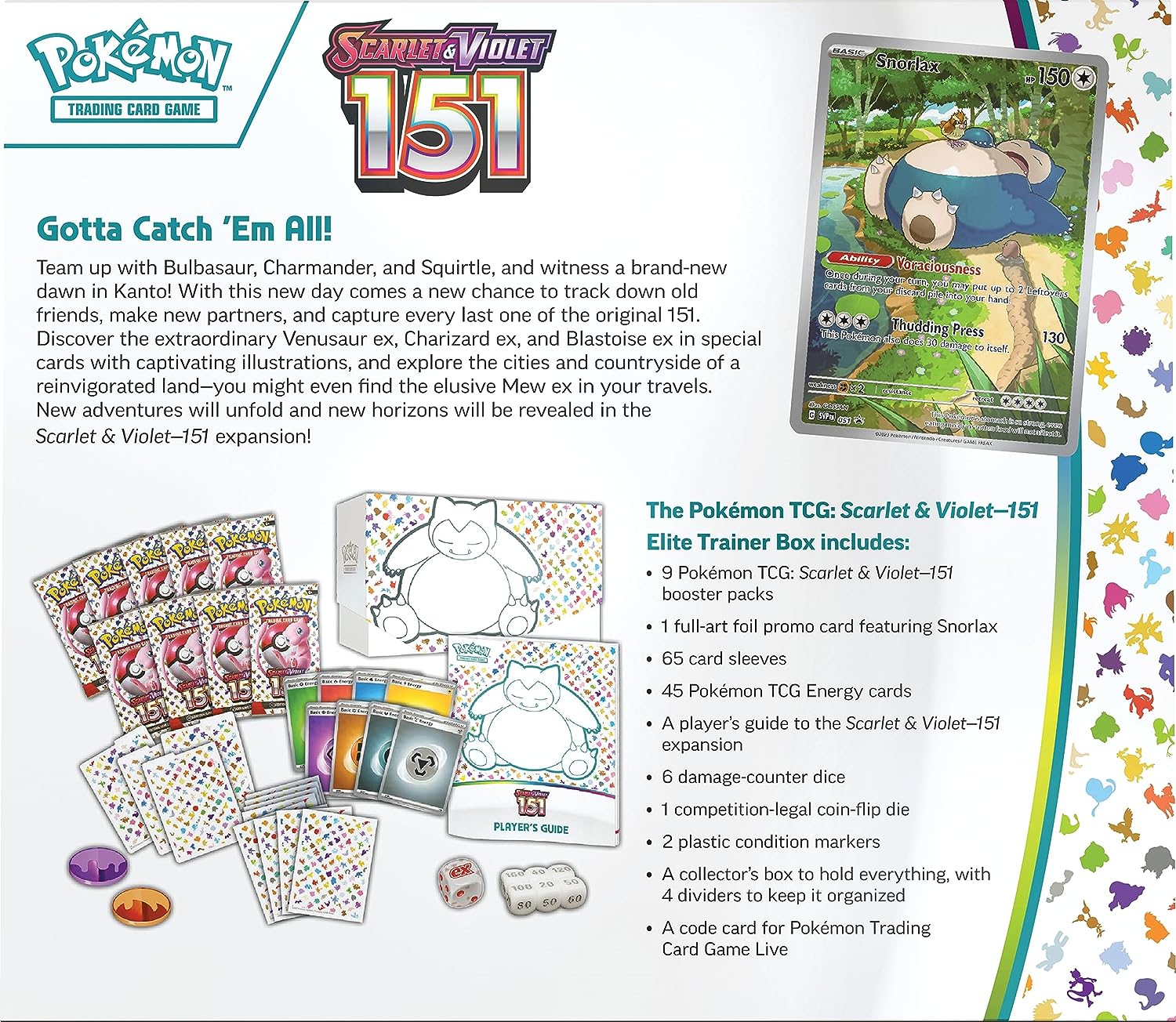 - Vous recevrez également 65 pochettes de cartes, 6 cubes de compteur de dommages, 2 marqueurs d'état en plastique, une boîte de collection avec 4 séparateurs, un guide du joueur pour l'extension Scarlet & Violet — 151 et une carte de code pour le jeu de cartes à collectionner Pokémon Live.